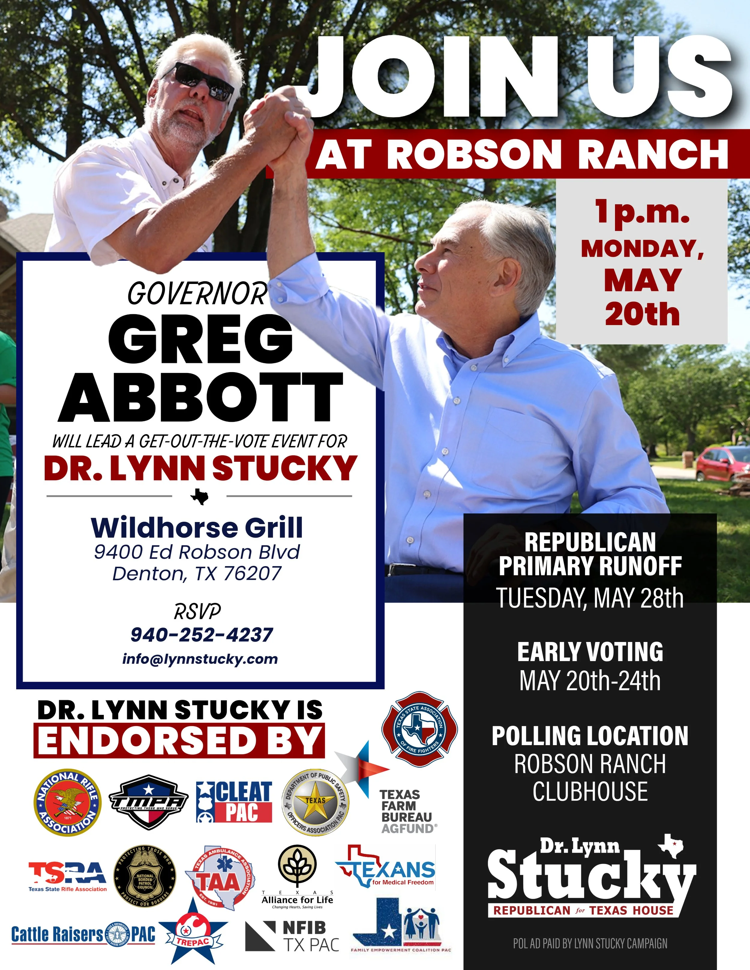 Governor Greg Abbott will join Team Stucky on May 20th for a Get-Out-The-Vote event at the Wildhorse Grill at Robson Ranch in Denton. This event is free and open to the public. Fill out the form below to RSVP for your chance to meet with Governor Abbott